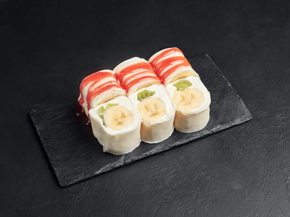 Крем сливочный, спринг-тесто, банан, киви, топинг клубничный