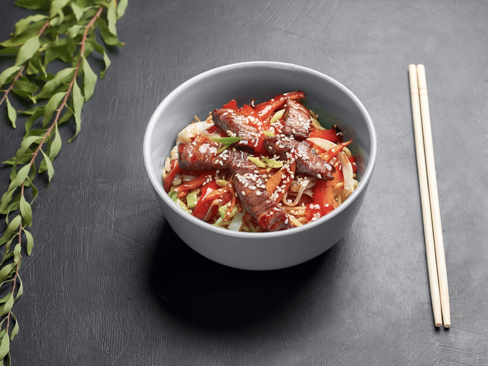 Говядина, овощной микс (цукини, морковь, паприка, капуста), яичная лапша, соус чили сладкий, соус шрирача, кунжут