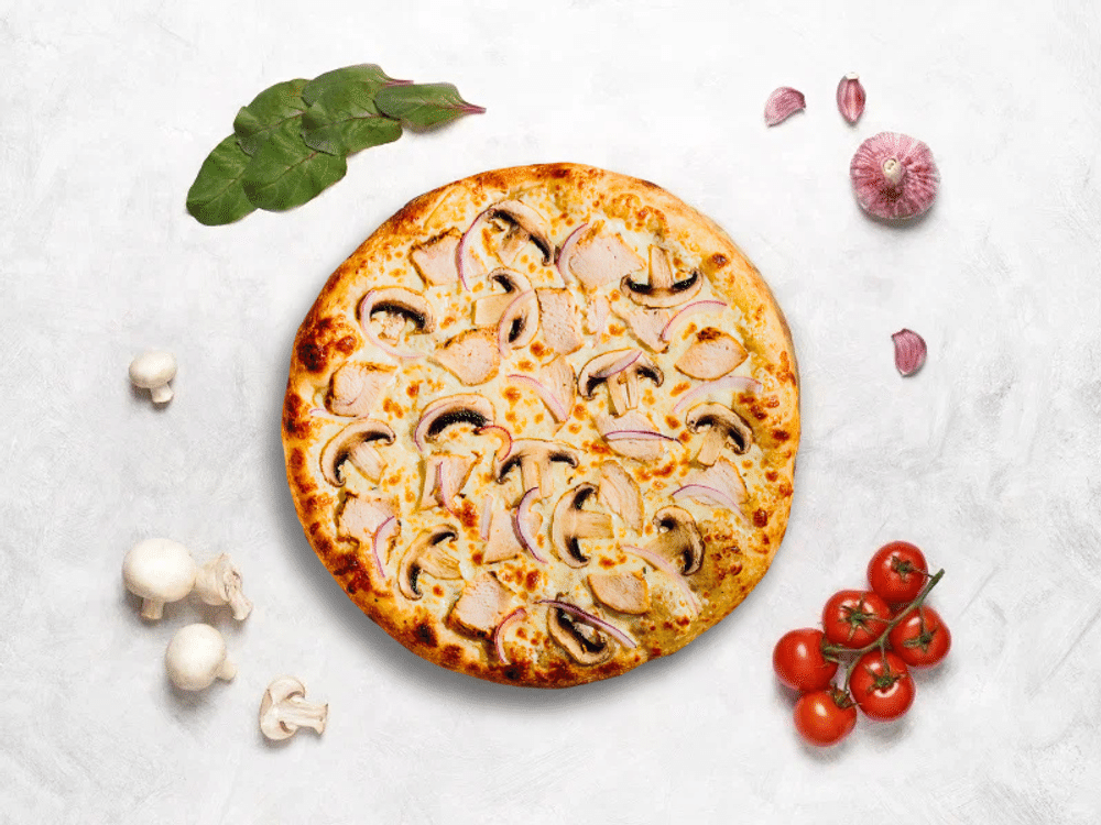 Соус грибной, сыр моцарелла, куриное филе, свежие шампиньоны, лук красный