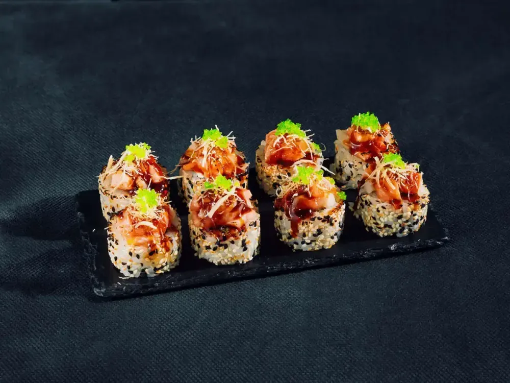 Нори, рис, сыр Cremette, лосось, морской гребешок, тамаго, авокадо, спайси соус, катаифи, тобико, унаги соус, кунжут