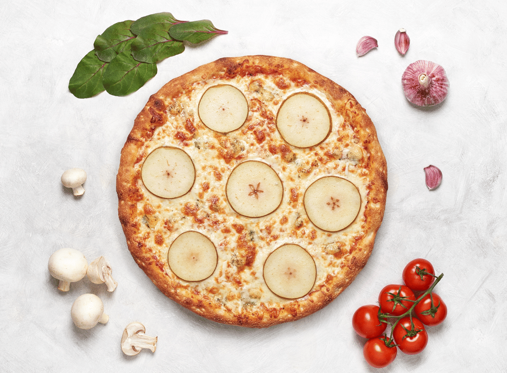 Соус фирменный чесночный, сыр моцарелла, сыр горгонзола, груша