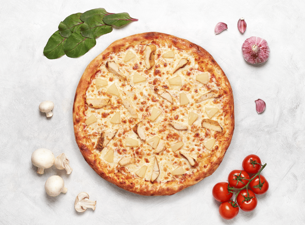 Соус мутти, сыр моцарелла, куриное филе, ананасы