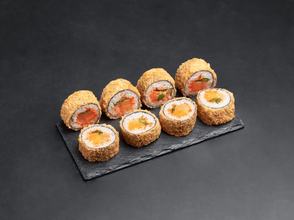 Нори, рис, лосось, огурец, сыр чеддер, лук зеленый, спайси соус, тобико, унаги соус, кунжут
