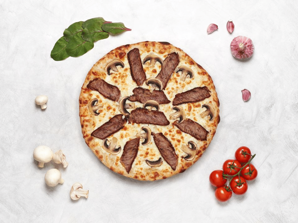 Соус фирменный чесночный, сыр моцарелла, запечённая говядина в травах, свежие шампиньоны