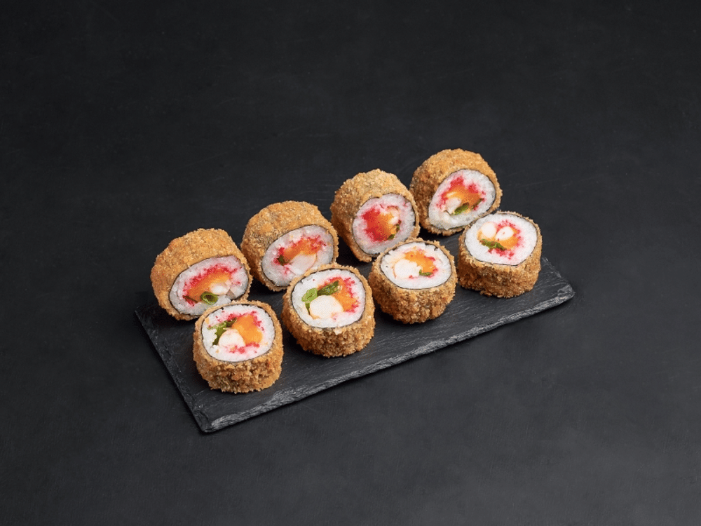Нори, рис, креветка, огурец, сыр чеддер, лук зеленый, спайси соус, тобико, унаги соус, кунжут