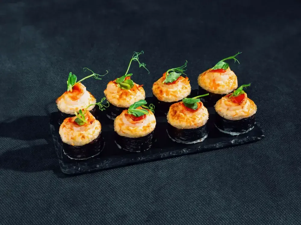 Нори, рис, снежный краб, креветка, огурец, авокадо, соус фирменный сырный, сыр горгонзола, шрирача, микрозелень