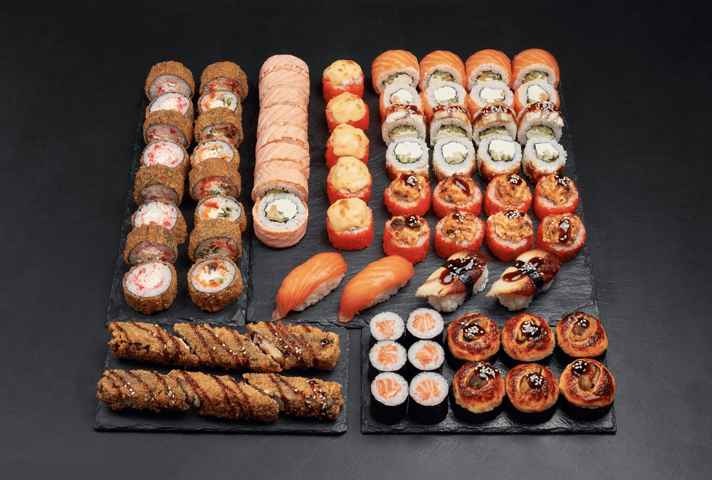 Филадельфия карамель, Темпура с крабом, Темпура с угрем, Запеченный Унаги Сяке, Запеченный премиум с мидиями, Запеченный Cheese, Филадельфия с угрем, Филадельфия, Маки лосось, 2 суши с лососем, 2 суши с угрем, Хрустящие палочки с лососем и крабом