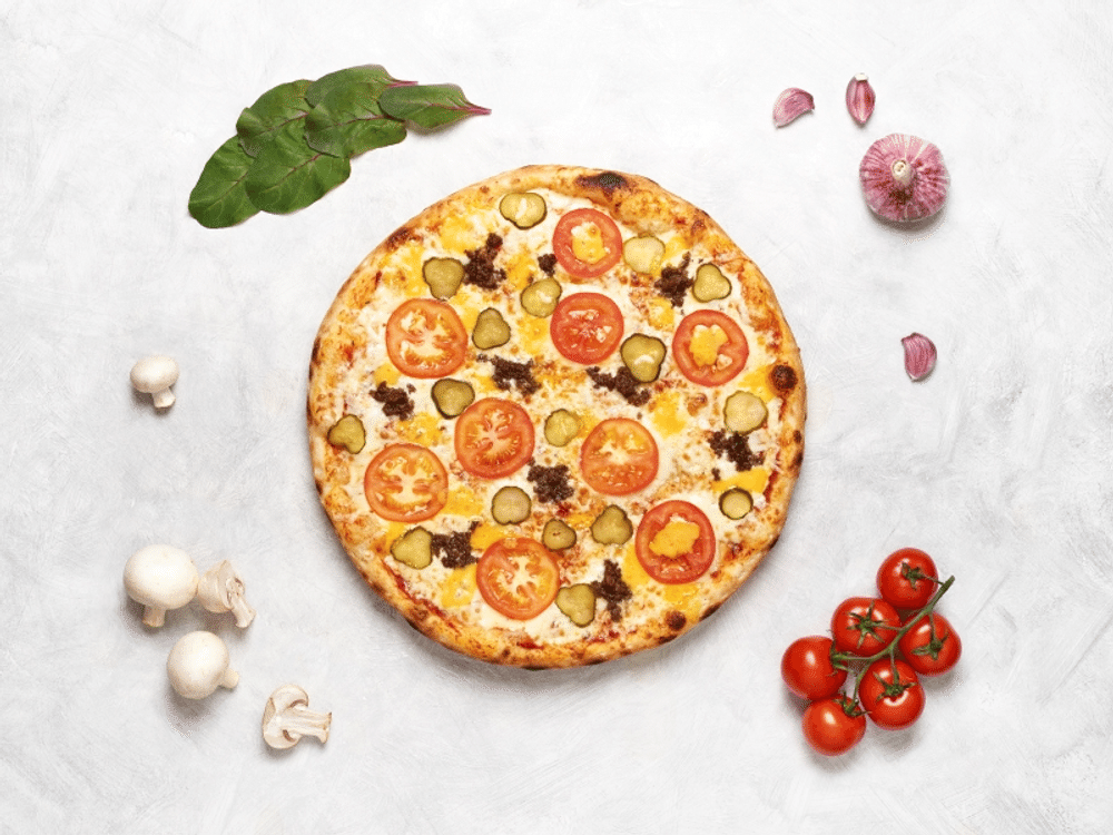 Соус мутти, сыр моцарелла, говяжий фарш, томаты, лук красный, маринованный огурец, сыр чеддер