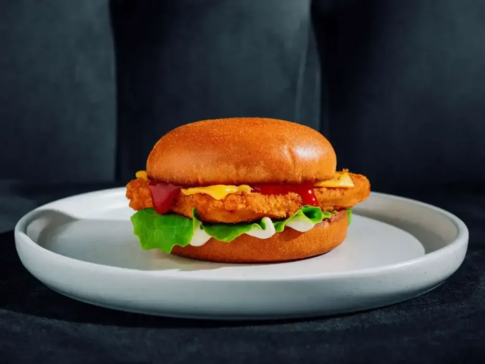 Булочка бриошь, куриная котлета, салат айсберг, сыр чеддер, соус майонезный, кетчуп
