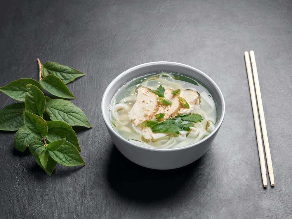 Бульон куриный, филе куриное, лапша удон, зелень