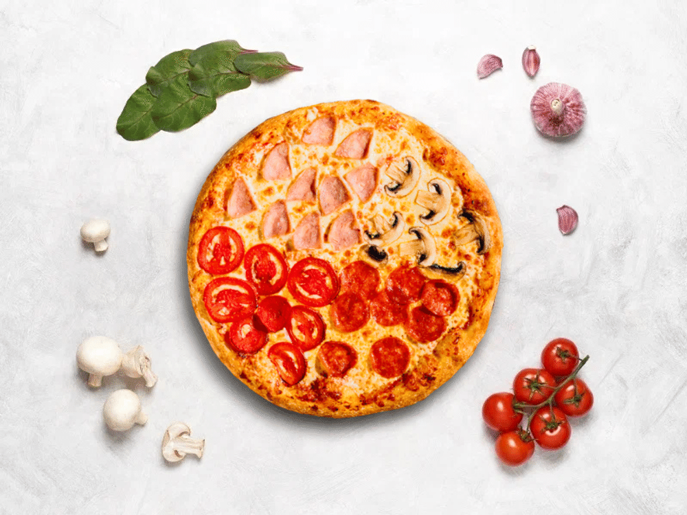 Соус мутти, сыр моцарелла, нежная ветчина, колбаски пепперони, томаты, свежие шампиньоны