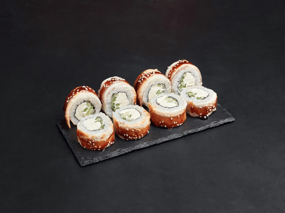 Нори, рис, сыр Cremette, угорь, огурец, унаги соус, кунжут