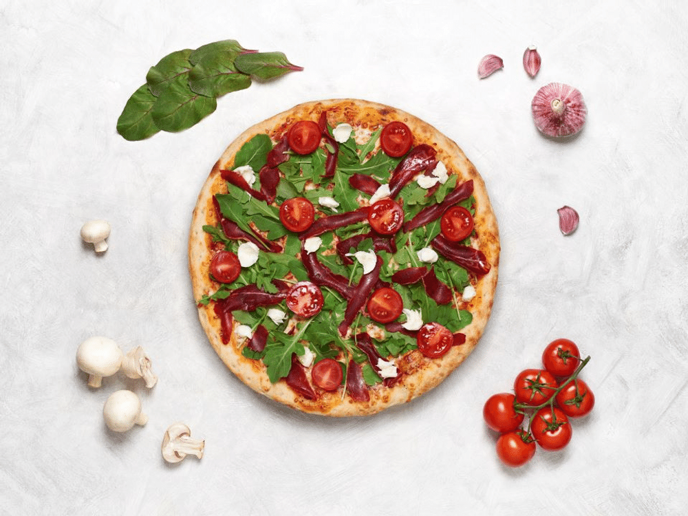 Соус мутти, сыр моцарелла, пастырма, руккола, томаты черри, моцарелла буфалло