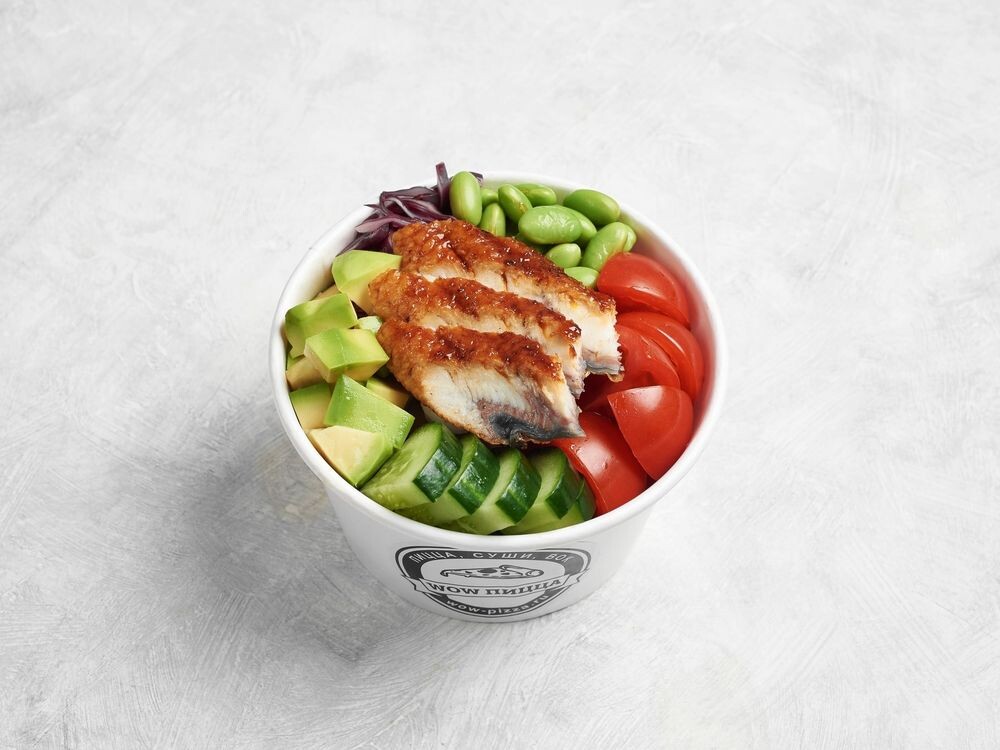 Рис, жареный угорь, авокадо, огурец, томаты черри, бобы эдамаме, унаги соус, соус поке, кунжут
