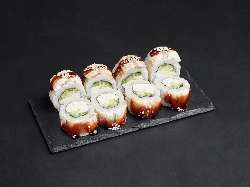 Нори, рис, сыр Cremette, угорь, лосось, огурец, унаги соус, кунжут