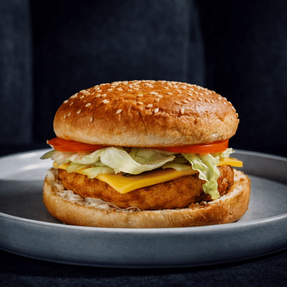 Булочка бриошь, куриная котлета, томат, салат айсберг, сыр чеддер, сыр пармезан, соус цезарь, соус майонезный