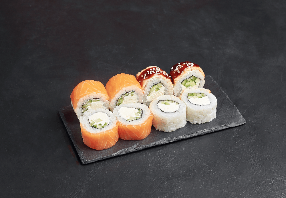 Нори, рис, сыр Cremette, лосось, угорь, огурец, унаги соус, кунжут