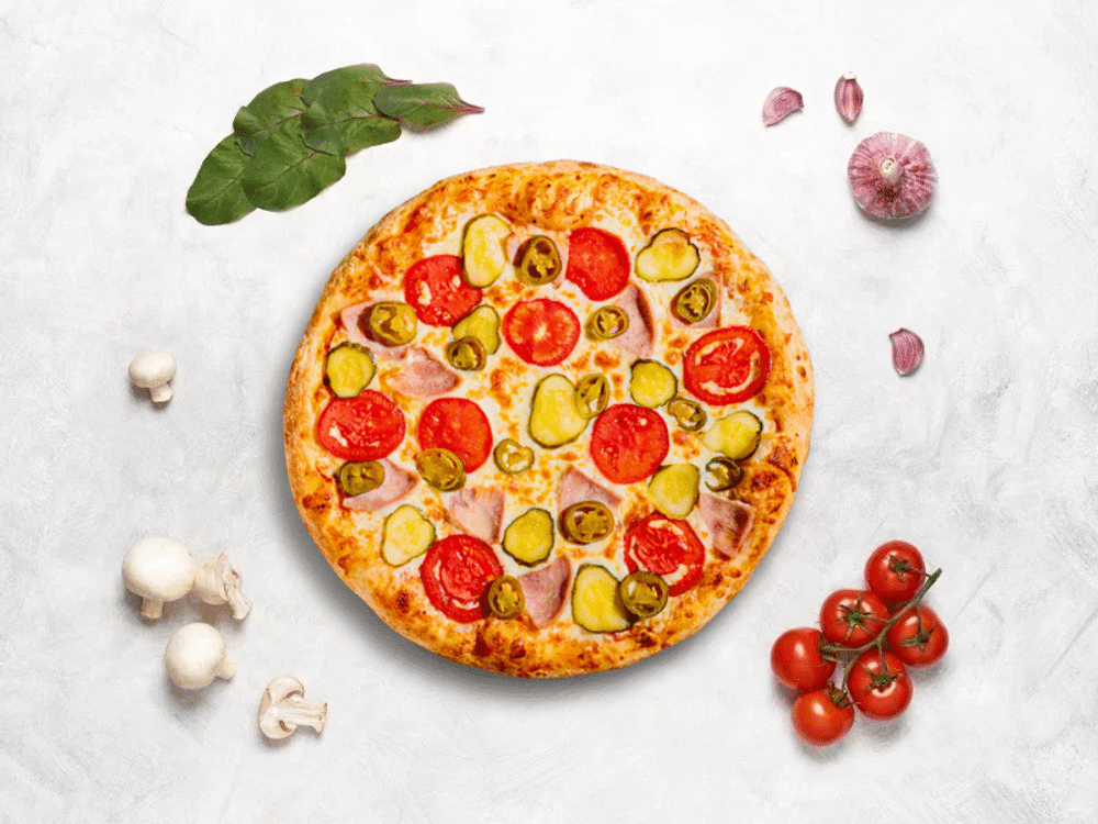 Соус мутти, сыр моцарелла, нежная ветчина, томаты, маринованный огурец, халапеньо