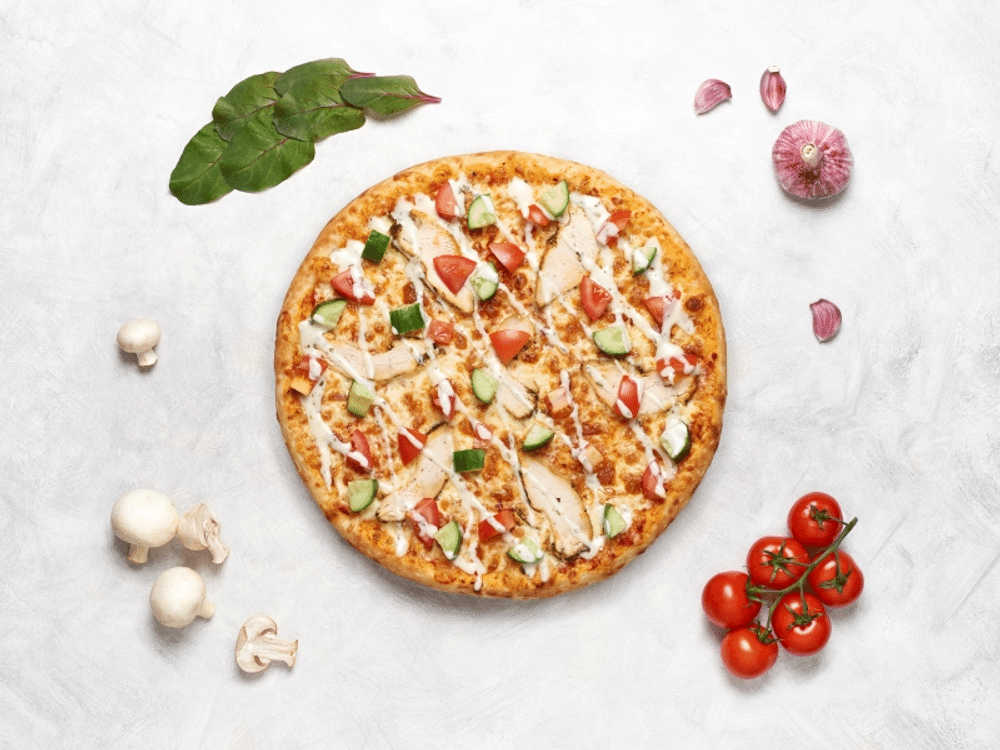 Соус мутти, сыр моцарелла, куриное филе, томаты, огурец свежий, соус фирменный чесночный