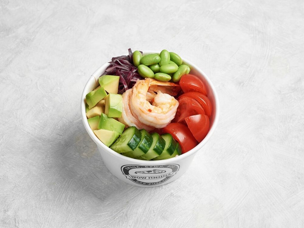 Рис, креветки тигровые, авокадо, огурец, томаты черри, бобы эдамаме, соус поке, лук зеленый, кунжут
