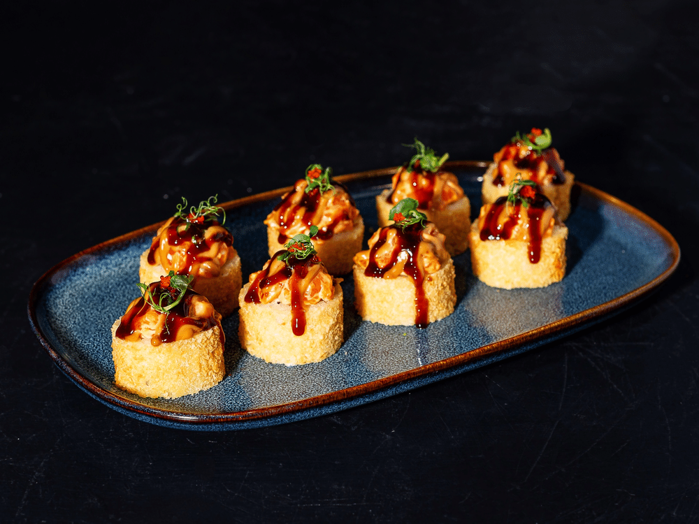 Нори, рис, сыр Cremette, лосось, огурец, сухари панко, кляр, тобико, спайси соус, соус карамель, унаги соус, микрозелень